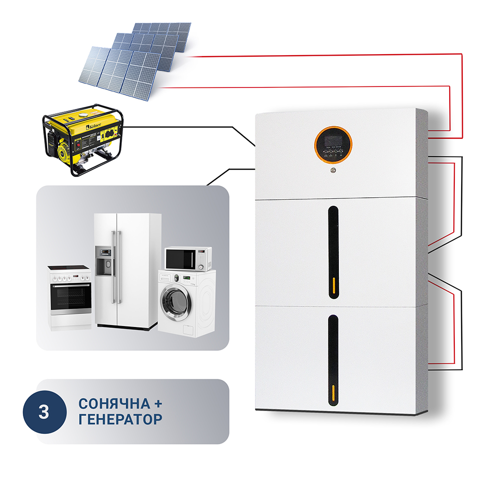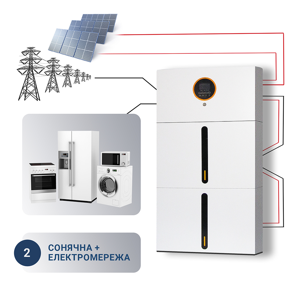 • Ця високоефективна система поєднує гібридний інвертор потужністю 5 кВт та 2 батарей LiFePO₄ загальною ємністю 10,24 кВт*год. Вона забезпечує автономну роботу вашого дому чи бізнесу, гарантуючи стабільне живлення навіть під час тривалих відключень електроенергії.